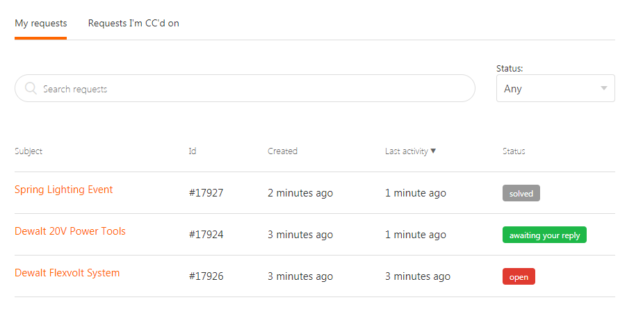 Your list of requests includes the subject, ID #, age (Created), time since last activity (Last activity), and current status. You can sort the list by the "Created" column, or the "Last activity" column.