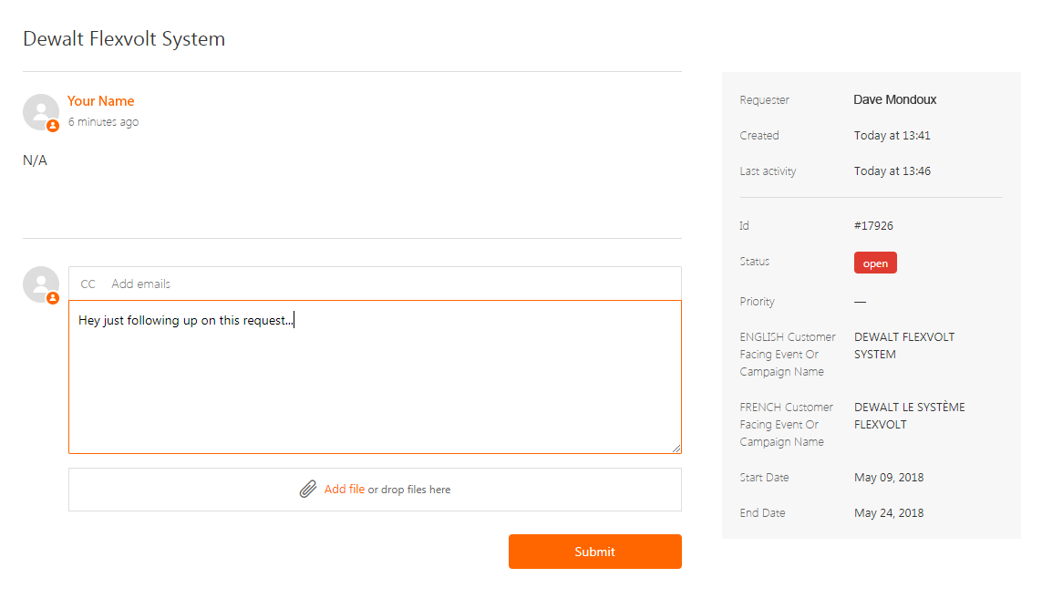 The main section of this page is used as a way for you and the Digital Promotions Team to communicate about your request. Comments and questions from the team will appear under your initial request, and you can use the text field and attachment tool to provide additional information.